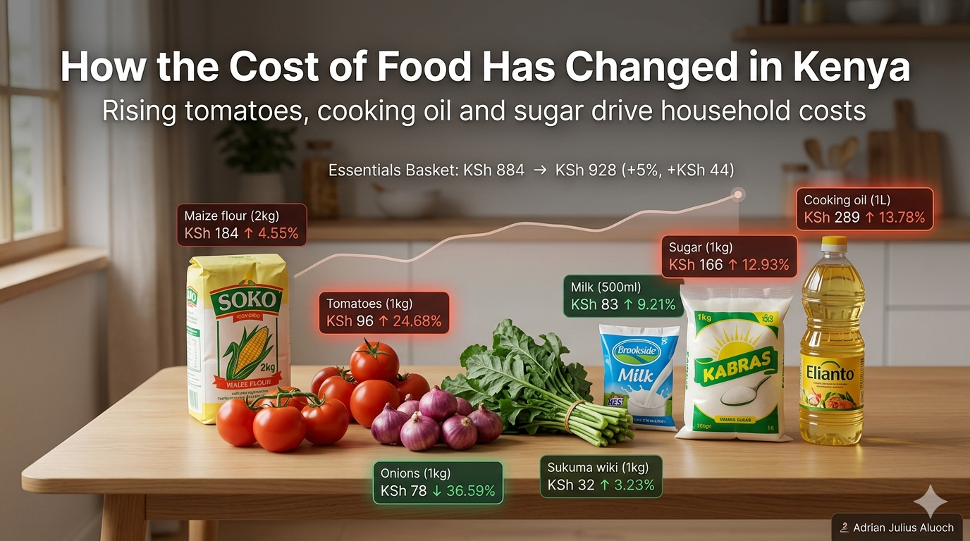 The problem is simple: families are struggling with rising food costs, and it’s not always clear which items are driving that squeeze. To answer this, I leveraged market price data from the World Food Programme Price Database and built an ‘essentials basket’ — maize flour, sugar, cooking oil, milk, sukuma wiki, tomatoes, and onions — the foods most households actually rely on every day.