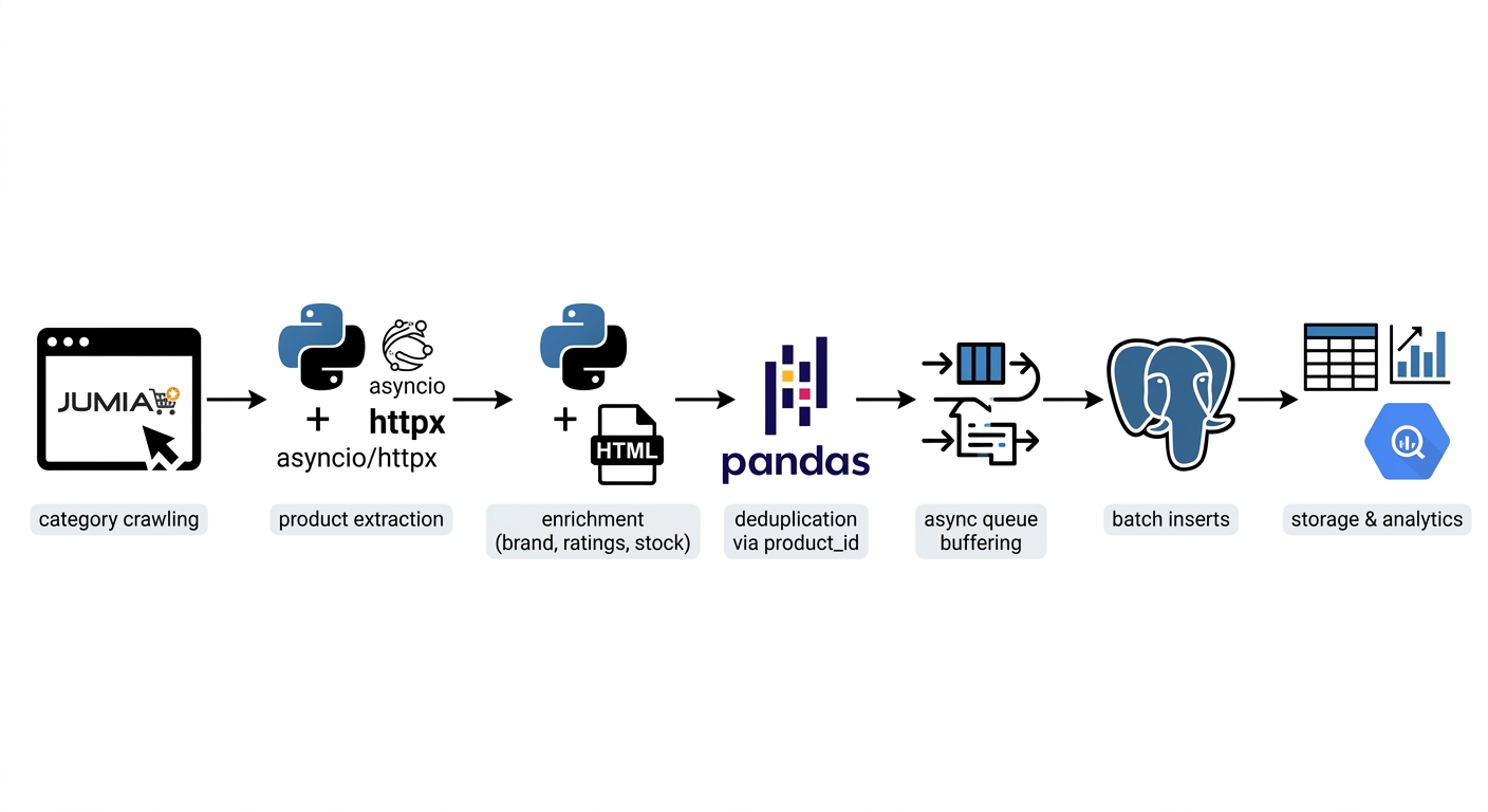 E-commerce data changes quickly, but tracking those changes over time is not straightforward. To solve this, I developed an asynchronous scraping pipeline that collects product data from Jumia at scale, storing it in PostgreSQL with logic to capture only meaningful updates in prices, discounts, and availability. To better understand customer behavior, I extended the pipeline to also collect product reviews — including ratings, text, and timestamps — making it possible to connect pricing decisions with customer feedback and sentiment over time.