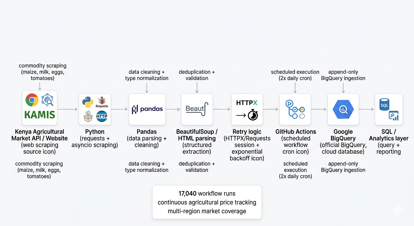 Market price data is only useful if it’s consistent and up to date. To solve this, I set up an automated pipeline that continuously collects, processes, and stores agricultural market data in BigQuery. With over 17,000 scheduled runs, the system provides a reliable foundation for tracking price trends across regions over time.