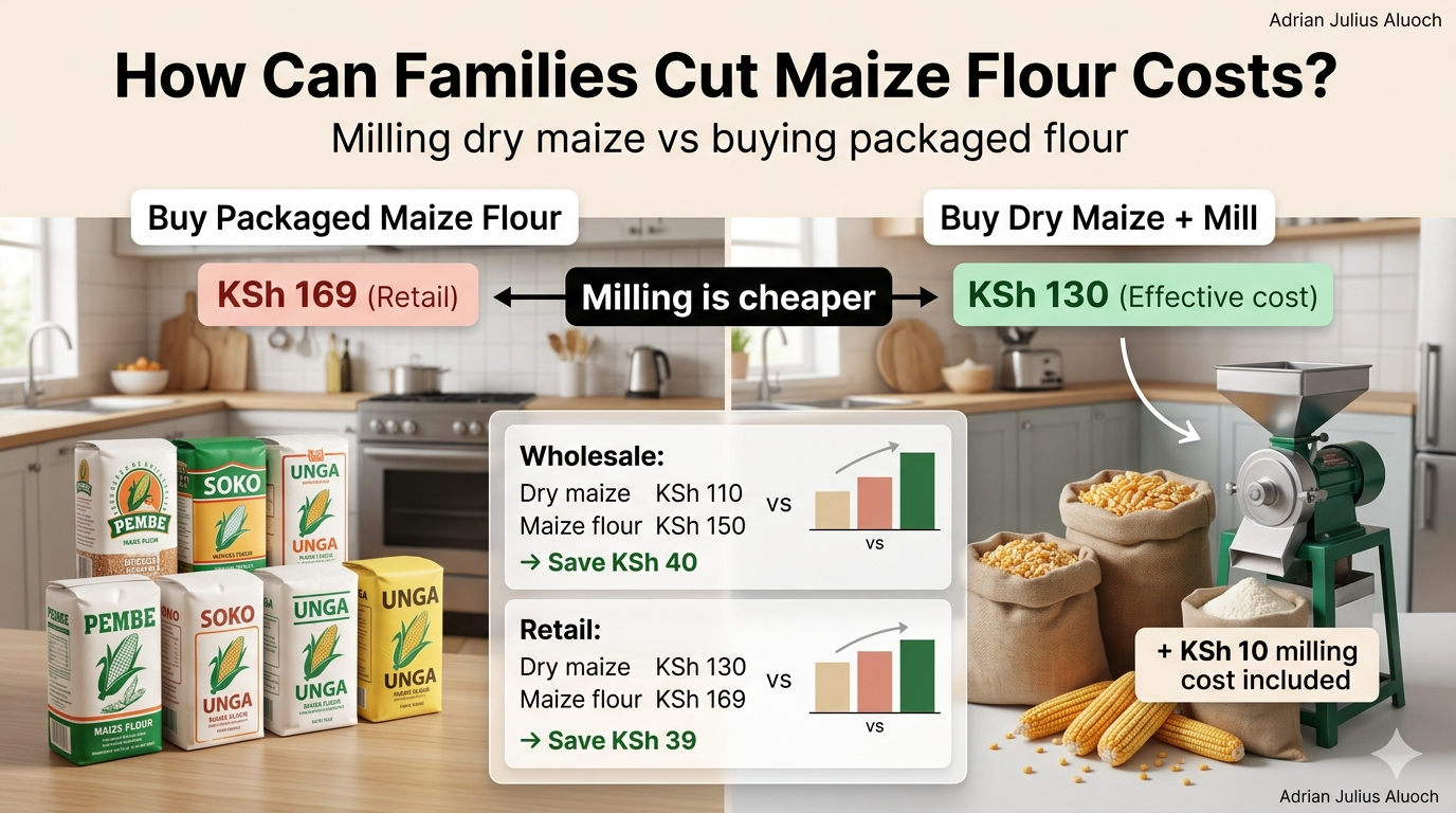 Maize is a staple food in Kenya, forming the foundation of daily meals for millions of households. For many families, the choice between buying dry maize and milling it locally or purchasing already processed maize flour is an important economic decision. While conventional wisdom suggests that milling your own maize is cheaper, market conditions, milling costs, and grain-to-flour conversion yields may alter the actual cost advantage.